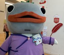 安田町のイメージキャラクターです。募金活動の応援をお願いしたら、腕(ひれ?)の上に募金箱を乗せて応援してくれました!